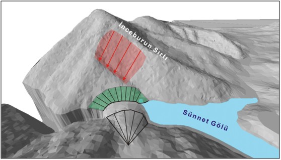Heyelan engelinin vadi içindeki yüksekliği 1055 m' dir. Göl yüzeyi 2009 yılında deniz seviyesinden 1030 m yüksekteydi ve mevsimsel olarak 4-6 m kadar değişiyordu. Gölün beslenme alanı 11.4 km2, göl yüzey alanı ise (mevsimlere göre değişmekle birlikte) 0.18 km2 kadardır. Gölü güneyden besleyen 3 dere bulunur.