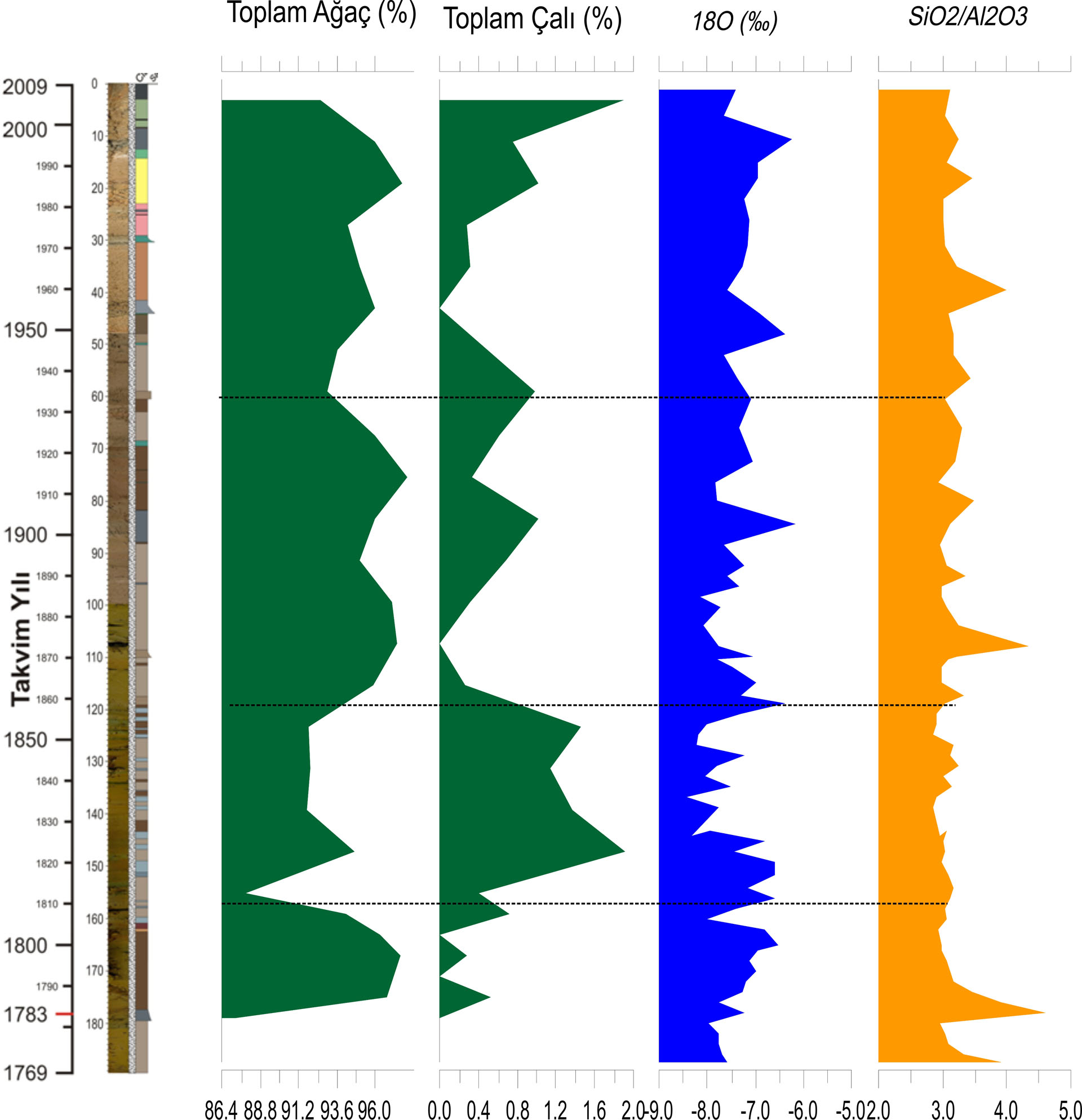 Çalışmalarımız gösteriyor ki, Sünnet bölgesinde son 250 yıl içinde iklimler önemli değişimler geçirmiş. Üstteki grafikte 1800 ile 1850 yılları arasında oluşmuş çamurlarda ağaç polenlerinin az, çalı polenlerinin çok olduğunu farkettiniz mi? Bu çamurlar içinde ağır oksijen de daha az. Bu veriler bu dönemin daha yağışlı olduğu anlamına gelebilir. Bu dönemin öncesi ve sonrasında yağış daha az olmalı.