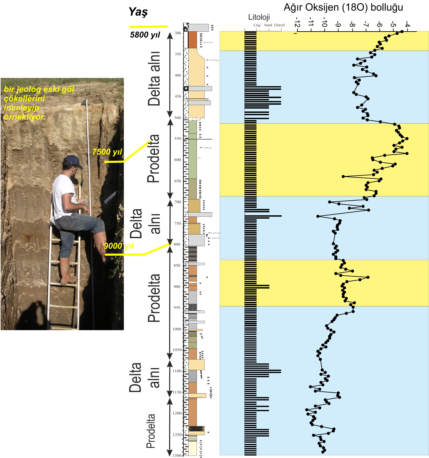 Eski göl çamurları farklı renk ve tane boyunda tabakalardan oluşuyor, içlerinde bolca gölde yasayan kabuklulular var (üstteki çizime bakınız). Bu çamurların tabanı radyokarbon yöntemi ile günümüzden 9600 yıl önceye, tavanı ise 5600 yıl önceye yaşlandırıldı. İzotop çalışmaları ağır oksijenin (18O) zamanla değiştiğini gösteriyor. Bu, yağış ve sıcaklığın değiştiğini gösteriyor. Buna göre, günümüzden önce 10 bin-7 bin yılları arasında sıcak ve bol yağışlı bir iklim varken, günümüzden 6 bin yıl önceye doğru hava soğuyup kuraklaşmaya ve göl su seviyesi düşmeye başlıyor.
