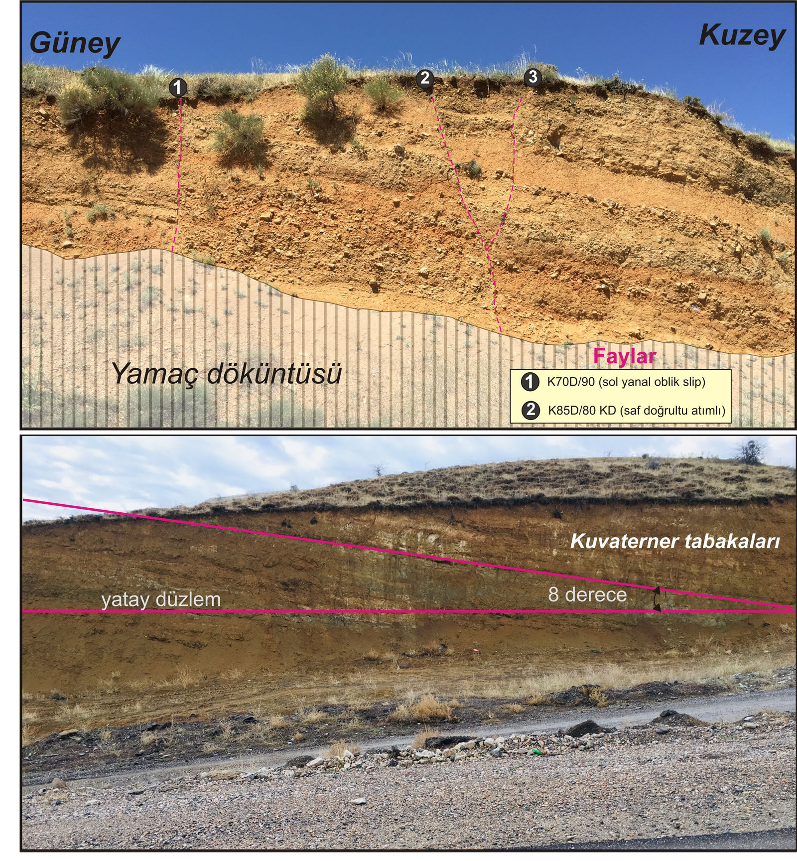 Kuvaterner tabakaları (a) ve bunları kesen faylar (b).