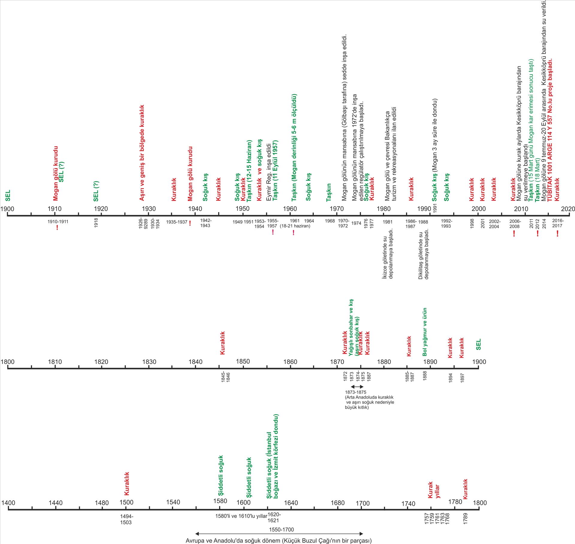 Eski-iklim araştırmalarında tarihsel ve aletsel veriler de önemlidir. Bu nedenle Osmanlı ve Cumhuriyet Dönemi resmi arşivlerini, Cumhuriyet döneminde bazı kamu kurumlarının (Devlet Meteoroloji İşleri (DMİ), Devlet Su İşlerinin (DSİ) ve Elektrik İşleri Etüt İdaresinin (EİEİ)) ölçüm ve kayıtlarını da inceleyerek Mogan ve Eymir gölleri civarında yaşanan aşırı kuraklık, aşırı soğuk ve taşkın olaylarını araştırdık (Şekil 9). Osmanlı arşivlerinde erişilebilen kayıtlar 1500’lü yıllardan başlamaktadır. Bu tür kayıtlar hükümet tarafından yapılan görevlendirmeler, araştırma-inceleme kayıtları, hükümetçe alınan tarımsal kararlar gibi ölçüme dayanmayan; ancak kuraklık, kıtlık, sel, aşırı soğuk ve kar yağışı gibi önemli meteorolojik olayları ve sonuçlarını bildiren tarihsel kayıtlardır. Cumhuriyet döneminde ise 1926 yılından bu yana DMİ’nin Ankara istasyonunda meteorolojik ölçümleri, DSİ’nin ve EİEİ’nin 1960 yılından günümüze kadar geçen sürede yaptıkları göl seviye ölümleri ve DSİ arşiv kayıtları çok değerli sayısal verilerdir. Elde ettiğimiz sonuçlar alttaki şekilde gösterilmektedir.