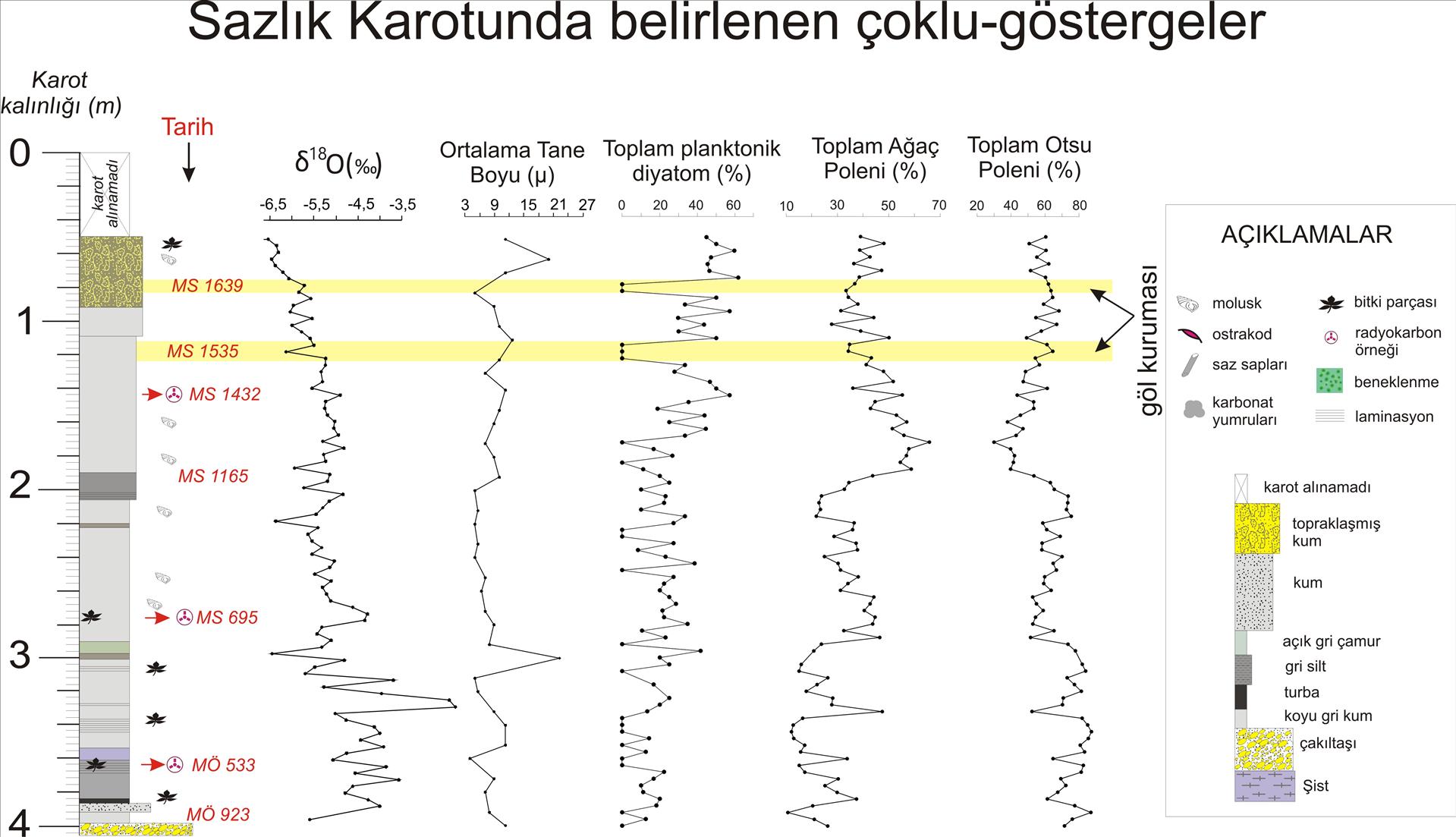 Mogan Gölü ortasında, 5 m su derinliğinden yalnızca 130 cm kalınlığında karot (D1B-1A karotu) alabildik. Karotun tabanına yakın bir seviyesi radyokarbon tekniği ile günümüzden 580 yıl önceye (yani MS 1436 yılı) tarihlendi (Şekil 7). Karot boyunca 18O izotop oranının, tane boyunun ve bazı diyatom türlerinin belirgin değişimleri gözleniyor. 18O oranında daha pozitif değerlere kayma çoğunlukla kuraklığa (yüksek buharlaşma ve az yağış) işaret eder. Buna göre MS 1435-1745 arasında alanın önemli oranda ağaçlarla ve daha az olarak otlarla kaplı olduğu, MS 1745’ten itibaren artan kuraklık ve kısmen insan etkisi yüzünden ağaçların azaldığı ileri sürülebilir. MS 1650-1745 arasında göl en derin haldedir (planktonik diatomlar en bol). Karotlardaki sedimanların belli seviyelerdeki kırıklı yapısı 1800’den itibaren Mogan Gölü’nün 4 kez tamamen kuruduğunu göstermektedir. MS 1615 ve 1400’lü yıllara karşılık gelen seviyelerde hiç diyatom bulunmaması muhtemel gölün onlarca yıl tamamen kuruduğunu gösterir.